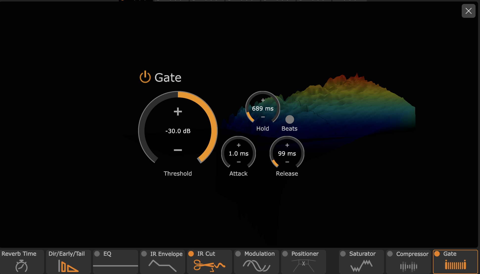 These two are similar, so it’s best to cover them in one section. Both IR Cut and Gate perform the same task, just with different approaches and subtleties. The Gate works like any you’ve encountered. You have a Threshold that once the audio drops below, the reverb tail attenuates based on the attack, hold, and release settings. However, the IR Cut physically trims the IR either at the reverb’s start, end, or a combination of the two. To make things less abrupt, you’re given a Fade In and Fade Out. If we’re going on utility alone, the IR Cut most likely edges out the Gate due to its ability to cut the beginning of the reverb. For instance, if your IR has a much longer Pre-delay than you need.